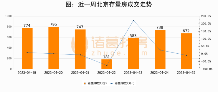 从存量房来看,2023年04月25日北京存量房单日成交672套,比昨日减少66套,环比下降8.9%。从近一周存量房成交来看,北京存量房日均成交套数为641套,04月25日单日成交672套,高于近一周平均水平4.8%。