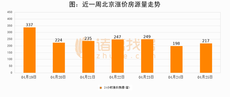 根据诸葛找房数据显示,北京24小时涨价房源量为217套,较04月24日增加19套,环比上涨9.6%。与此同时,涨价房源占比小幅扩大,业主信心有所提升。