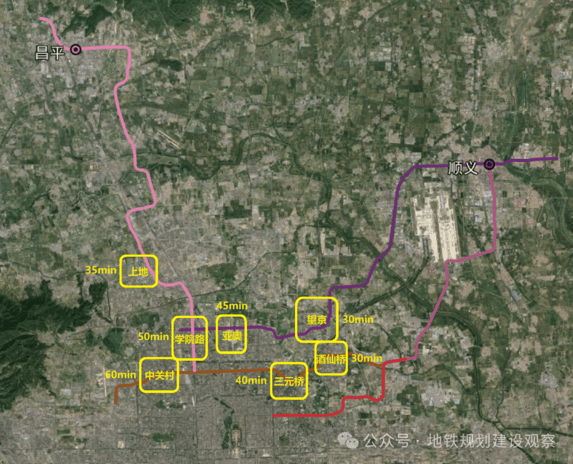 下图为昌平、顺义2座车站的地铁直达范围及时间,M15与R4-M12的黄金双轨,将北城除上地以外的产业区一网打尽。