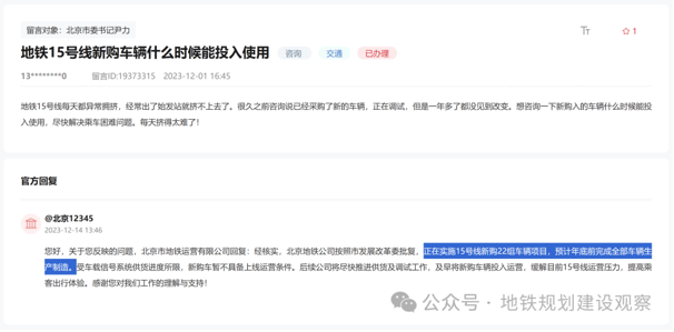 15号线新购置的22组列车已经于去年底生产完毕,只不过因为信号系统问题没有上线运营,很快就会解决。