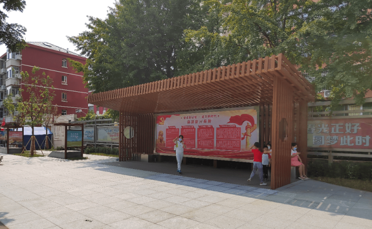 小区东一门外的这处占地510平方米的广场,漫步其中,原木色的亭廊下,几位居民正在宣传栏前讨论,一旁新增添的竹木座椅上,几个孩子正凑在一起读绘本。穿插于休息区新补种的绿植,让居民能够“抬眼见绿”。