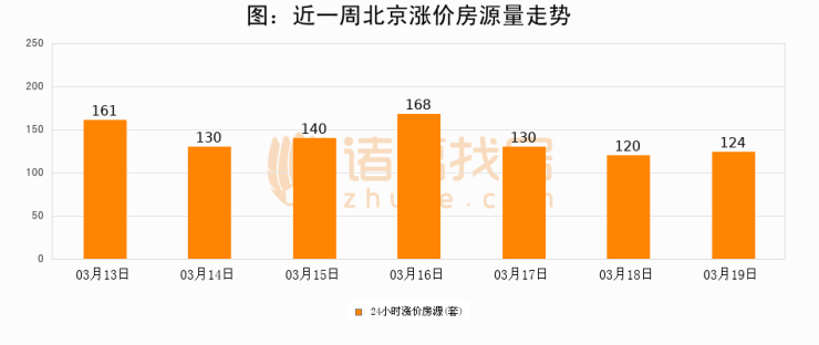 根据诸葛找房数据显示,北京24小时涨价房源量为124套,较03月18日增加4套,环比上涨3.3%。与此同时,涨价房源占比小幅扩大,业主信心有所提升。