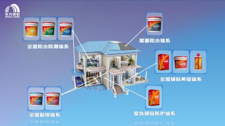 东方雨虹美丽城镇系列分为全屋防水防潮体系、全屋铺贴美缝体系、全屋粘接体系、室外铺贴防护体系和屋面防水体系,通过体系升级落脚在用户痛点问题的解决方案上,将专业研发下沉到家居空间的场景中,构成了美丽城镇系列产品矩阵。