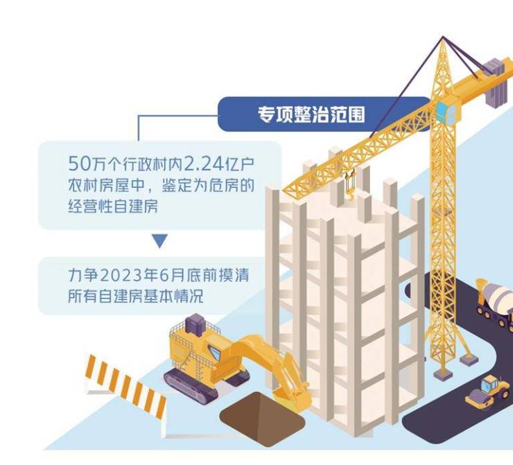 据介绍,专项整治分为排查和整治两个阶段,并分别对经营性自建房和其他自建房提出具体工作要求。《方案》要求各地立即开展“百日行动”,及时消除经营性自建房存在的安全隐患,坚决遏制重特大事故发生;同时,对其他自建房进行全面排查,力争于2023年6月底前摸清所有自建房基本情况;在此基础上,加快推进分类整治工作,力争用3年左右时间完成全部自建房安全隐患整治。