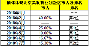 这一年北京美联物业也在顺义别墅区开了排名前列家门店,经过10年的发展,已在别墅区占据一定地位,根据2017年以来的数据显示,北京美联物业在顺义别墅的市占率位列第三。下面是北京美联物业1~7月份统计列举的一些项目(誉天下、万通、丽豪王府、龙湾别墅、裕京花园、优山美地等)的市占率,也可见美联物业的地位: