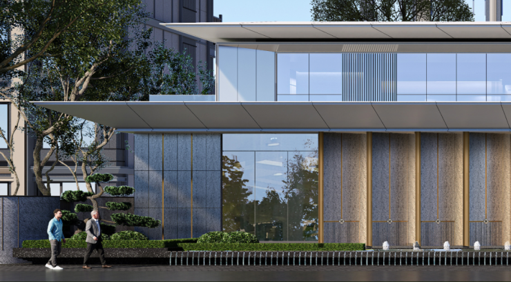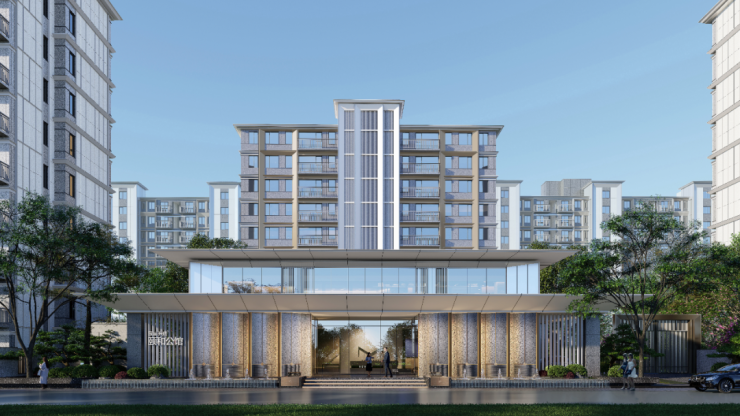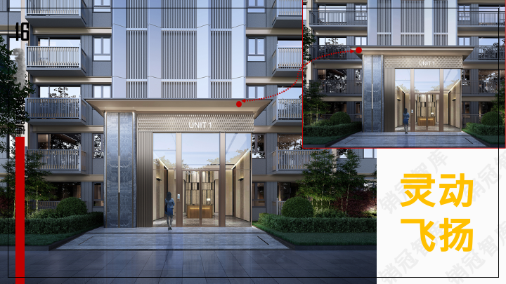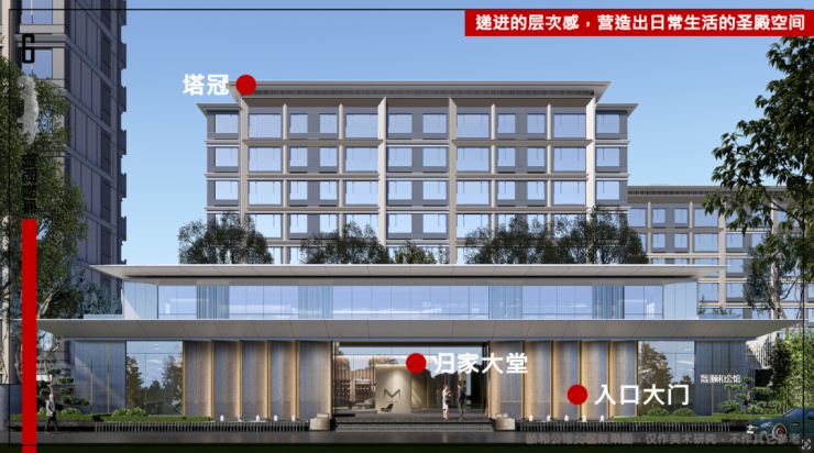 再把视线拉远一点,同样轻薄的飞檐,斜切的内檐,入口大门、归家大堂、住宅建筑,完美的形成了一个富有层次感的风景线。(看房可加小表弟微信XGXBD2023哦~)