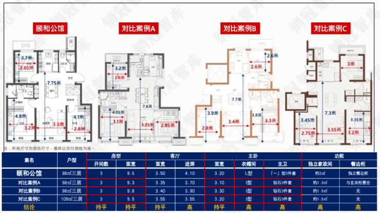 主力98平户型,表妹做了同面积段的量化分析,颐和公馆绝对是同面积段的佼佼者。
