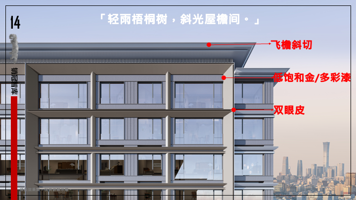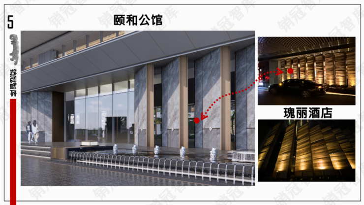 楼下的入户大堂,也用了相似的斜切+飞檐,大家可以看下这张对比图,如果是钜形框的堆叠,就有一种笨重感,但做了斜切后,灵动感就出来了,像被注入了生命。