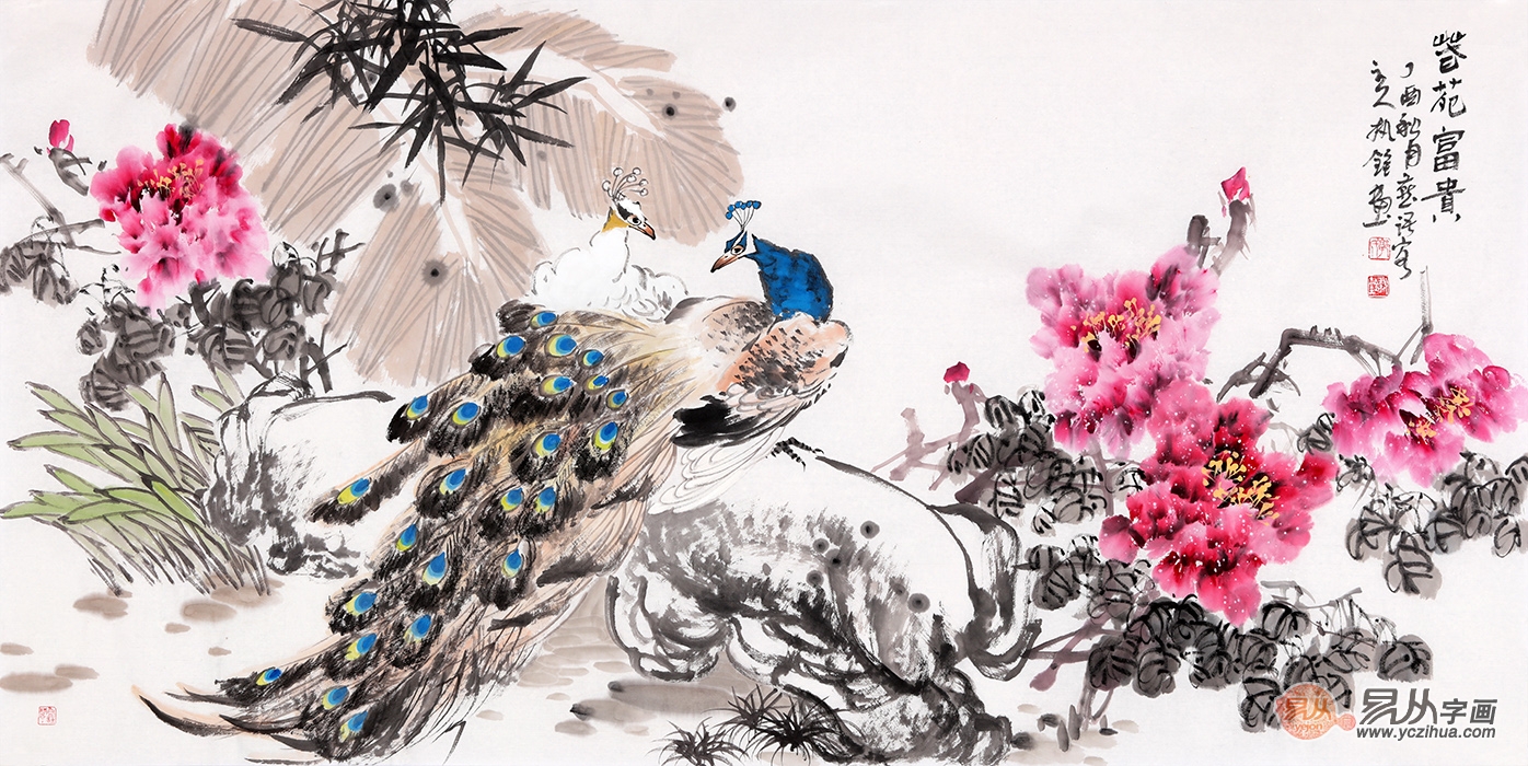 郭执铨新品佳作牡丹孔雀图《春苑富贵》(作品来源:易从网)