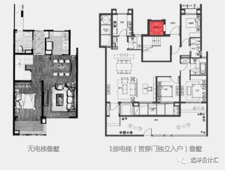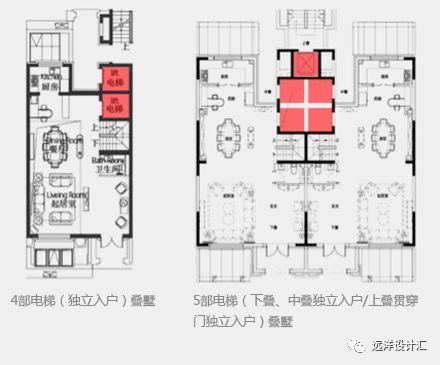 不同档次的叠墅产品在电梯配置数量上差别巨大,有不设置电梯的(4层及以下叠墅),有上、中、下叠共用一部电梯的,有下叠不设电梯、中叠和上叠设置电梯的,还有上、中、下叠分别设置私家电梯的,并且由于电梯位置和数量的不同导致户型格局差距很大,因此电梯的设置和数量是叠墅产品分类的另一重要元素。