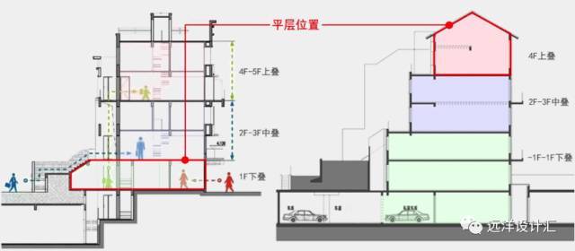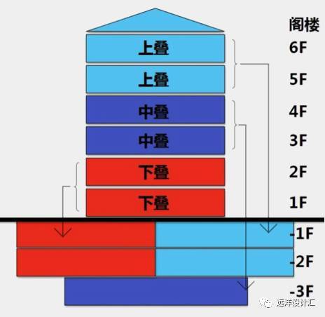 从叠加模式来看,叠墅产品的主要有5种情况,其中是较常见的两层一跃,按上中下叠垂直叠加模式。