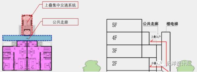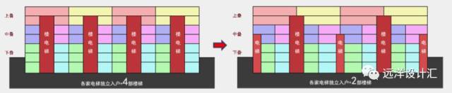 由于减少了公共楼梯,叠墅产品两方面得到了提升:一是公共楼梯减少后,作为普宅的“单元化”概念被弱化,独立感和私属性得到加强,更突显高端产品特质;二是公共楼梯减少后,公摊减少,叠墅地上得房率更接近纯别墅,业主实惠更多。此外,还有部分案例采用了上叠北侧室外公共走廊的办法,进一步减少公共楼梯数量,(如下图)。