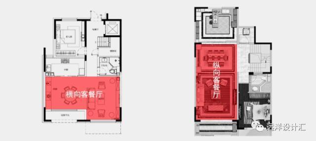 以客厅、餐厅设置的独立性为例,虽然独立的客厅、餐厅档次更高、功能更优,但是由于面积所限,经济型叠墅较普遍的还是采用客餐厅做法。一种做法是首层采用横厅设计,面宽8米,尺度舒适;另一种做法则采用传统的竖厅设计,从玄关处开始、客厅、餐厅、厨房自南向北铺排。