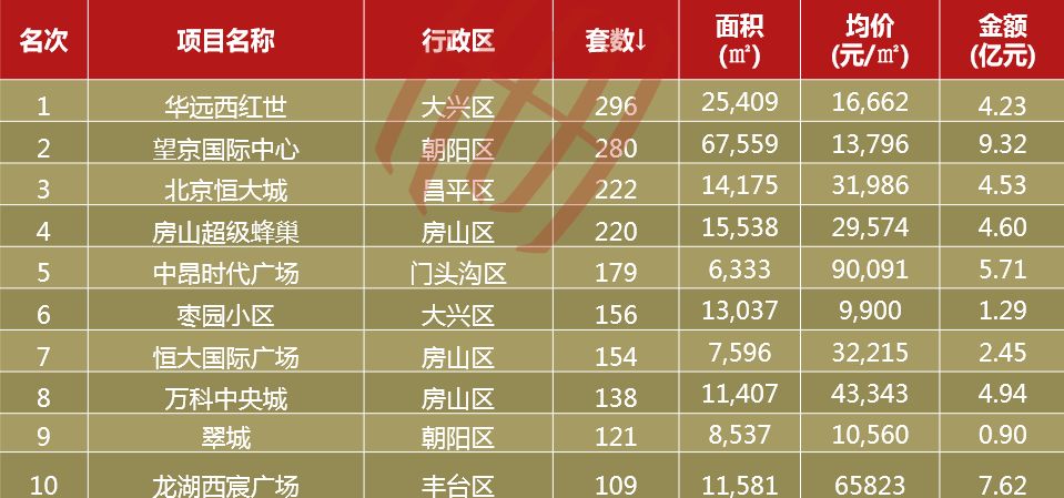 TOP1:华远西红世。2017年,商业总成交量4,571套,同比去年下降42%;成交均价27,118元/平方米,同比去年下降9%;存量20,434套,同比去年下降4%。华远西红世成交量居排名前列位,达296套,成交均价为16,662元/平方米,成交金额高达4.23亿元,望京国际中心成交套数仅次于华远西红世排名第二,成交套数280套。成交排名前10的项目如下: