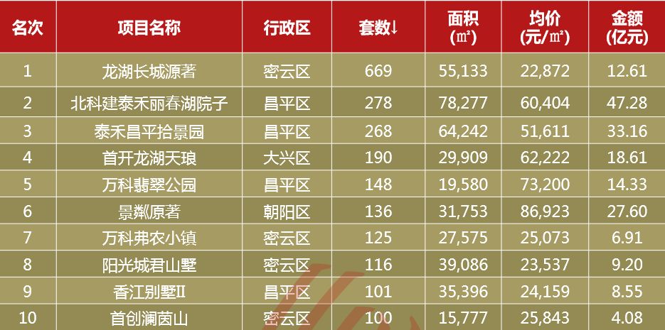 TOP1:龙湖长城源著。2017年,别墅总成交量4,984套,同比去年下降40%;成交均价44,446元/平方米,同比去年上 升20%;存量6,623套,同比去年下降8%。龙湖长城源著成交量居排名前列位,达669套,成交均价为22,872元/平方米,成交金额12.61亿元,北科建泰禾丽春湖院子成交套数仅次于龙湖长城排名 第二,成交套数278套,成交金额高达46.28亿元。成交排名前10的项目如下: