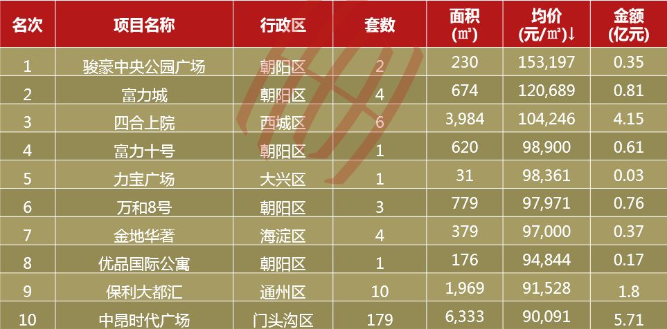 TOP1:骏豪中央公园广场。2016年,商业按成交均价排名前三的有保利海德公园、北京丰科万达广场、骏豪中央公园广场, 成交均价分别为108,526元/平方米、101,329元/平方米、95,804元/平方米。2017年,骏豪中央 公园广场跻居排名前列位,成交均价为153,197元/平方米,富力城、四合上院次之,分别为120,689 元/平方米、104,246元/平方米。今年较去年相比排名前三的均价都有所上升。成交排名前10的 项目如下: