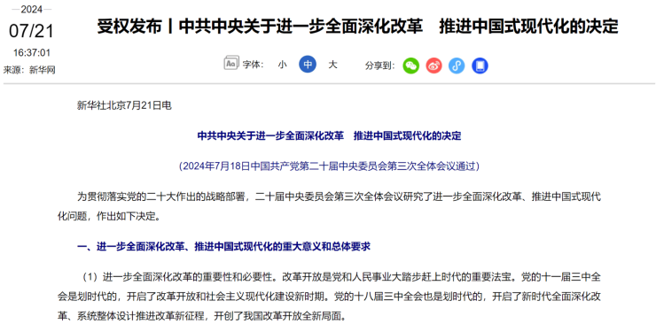 7月21日,新华社受权发布《中共中央关于进一步全面深化改革、推进中国式现代化的决定》(以下简称《决定》)。