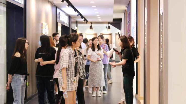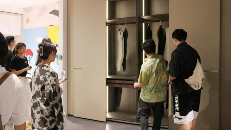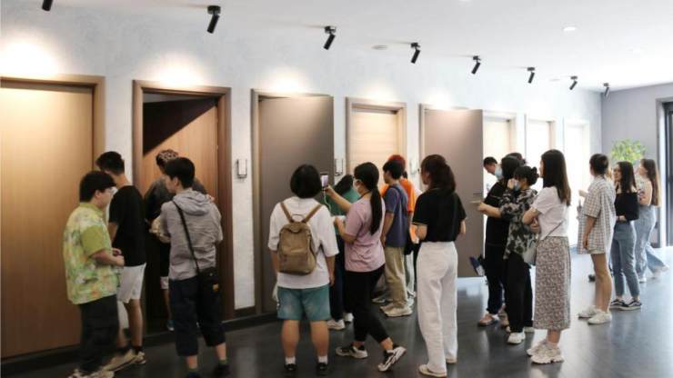 展厅参观时,霍尔茨独特的花色纹饰、极具创新性的T型门,以及诠释空间美学的门墙柜一体化产品,引得同学们阵阵惊叹。