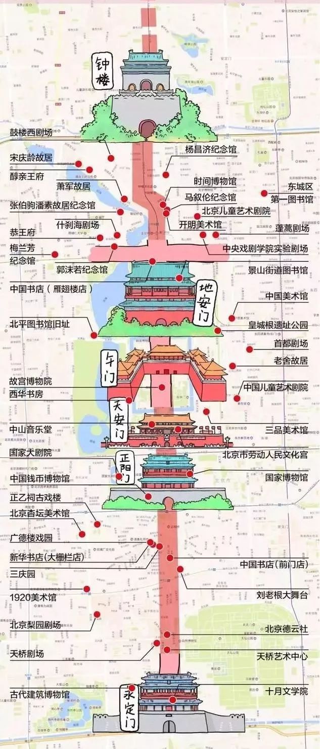 名胜古迹:正阳桥、五牌楼、天安门、故宫、毛主席纪念堂、兴华园、恭王府、国家大剧院。