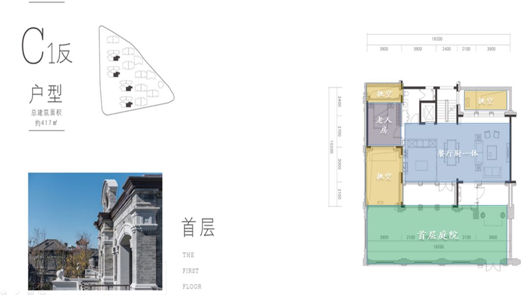C1户型合院产品首层设计起居室+老人房,另外大面积庭院花园。