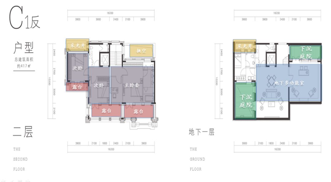 住宅分为A、B 、C 、D 、 E五个户型:A户型【双拼】5栋10户,单户599.62㎡,B户型【双拼】2栋4户,单户624.50㎡,【合院】C户型4栋16户,单户366.34—390.73㎡,【平层】D户型2栋4户,471㎡—506㎡,【独栋】E户型1栋一户,459.74㎡。
