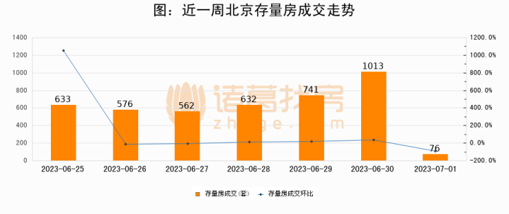 从存量房来看,2023年07月01日北京存量房单日成交76套,比昨日减少937套,环比下降92.5%。从近一周存量房成交来看,北京存量房日均成交套数为604套,07月01日单日成交76套,低于近一周平均水平87.4%。
