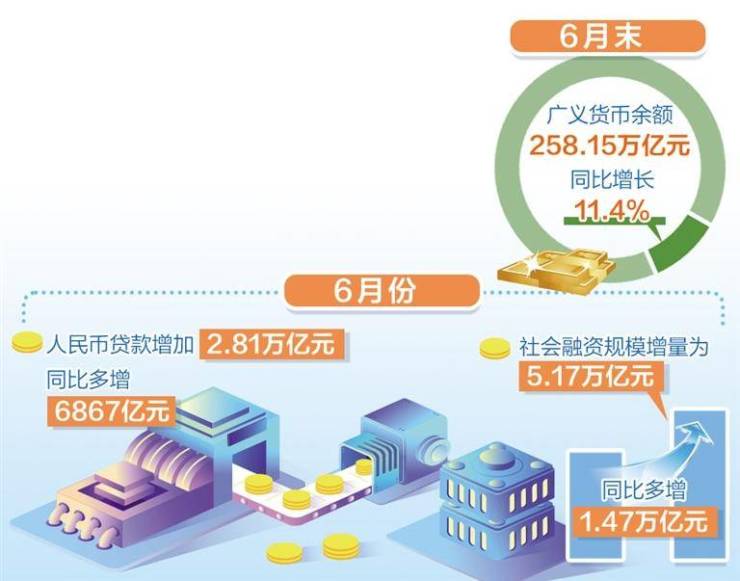 7月11日,中国人民银行发布数据显示,6月末,广义货币(M_2)余额258.15万亿元,同比增长11.4%,增速分别比上月末和上年同期高0.3个和2.8个百分点。6月份,人民币贷款增加2.81万亿元,同比多增6867亿元;社会融资规模增量为5.17万亿元,比上年同期多1.47万亿元。