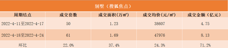 别墅方面,延续了上周环比上升19%的明显回温趋势,本周成交套数由50套上升到61套,环比上升22%;而成交金额由4.75亿元上升至8.13亿元,环比上升71.2%。