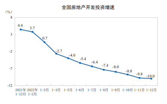 2022年,全国房地产开发投资额同比增速为-10.0%,从全年走势来看,1-12月较1-11月降速有了大幅度收窄,但近年来首次出现两位数降幅引发关注。