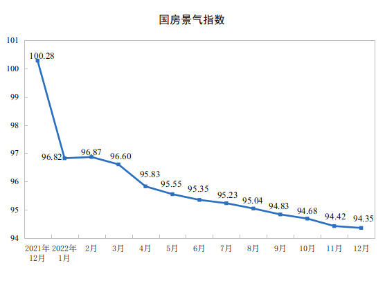 2022年12月份,房地产开发景气指数(简称国房景气指数)为94.35,而11月为94.42。