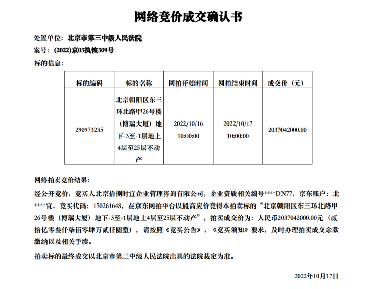 10月17日,博瑞大厦地下-3至-1层、地上4层至25层不动产于京东拍卖网拍卖。该场拍卖共吸引13333人围观。最终,北京拾捌时宜企业管理咨询有限公司以底价约20.37亿元拍下资产。