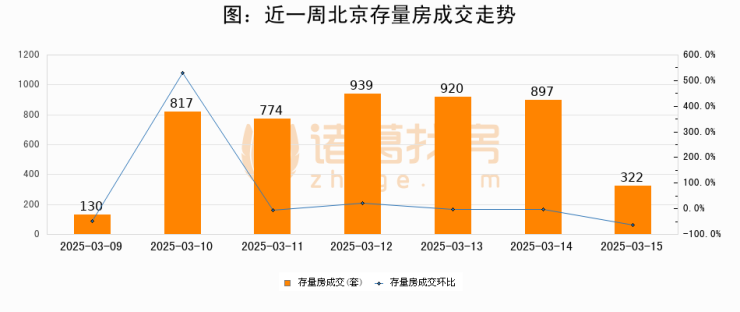 从存量房来看,2025年03月15日北京存量房单日成交322套,比昨日减少575套,环比下降64.1%。从近一周存量房成交来看,北京存量房日均成交套数为685套,03月15日单日成交322套,低于近一周平均水平53%。