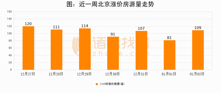 根据诸葛找房数据显示,北京24小时涨价房源量为109套,较01月01日增加28套,环比上涨34.6%。与此同时,涨价房源占比小幅扩大,业主信心有所提升。