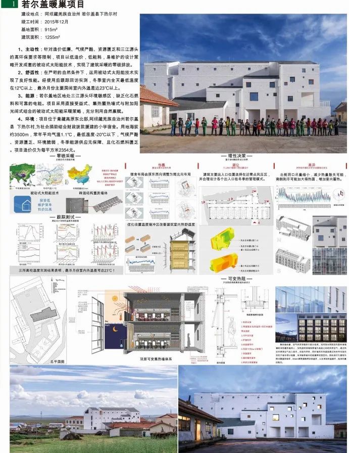专家评语-冯正功:暖巢项目在技术层面上,选择主被动结合的高新技术路线,但同时兼顾了环境与成本。该项目基于高原高寒的特殊气候环境,运用建筑信息化模型和性能化模拟,理性选择并创造性地使用了零碳采暖技术改善建筑性能,提高建筑对藏区特殊气候的适应性,低成本、低造价、易维护地营造舒适学习环境。更为重要的是,设计理念尊重藏区传统,延续地域文化,主动式建筑设计不失人文温度。在简洁的现代建筑形体上,采用当地材料页岩,因地制宜减轻环境负荷;在空间色彩上,提取藏族传统色彩,点亮儿童活动空间。