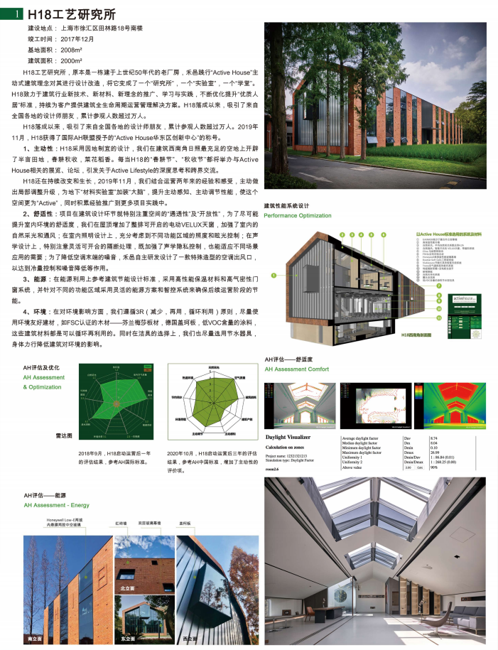 专家评语-仲继寿:H18是根据ActiveHouse理念对⼀栋建于上世纪 50 年代的⽼⼚房进⾏设计改造的项目。设计通过各种形式的“灰空间”,打破了“研究所”、“实验室”、“学堂”、“会议”、“展览”、“农耕”等各种功能的边界,以打造健康舒适的工作与交流环境为目标,实现了能源与环境的可持续性。值得一提的是,H18一直在持续改变和生长中,不断提升主动感知与主动调节的能力。