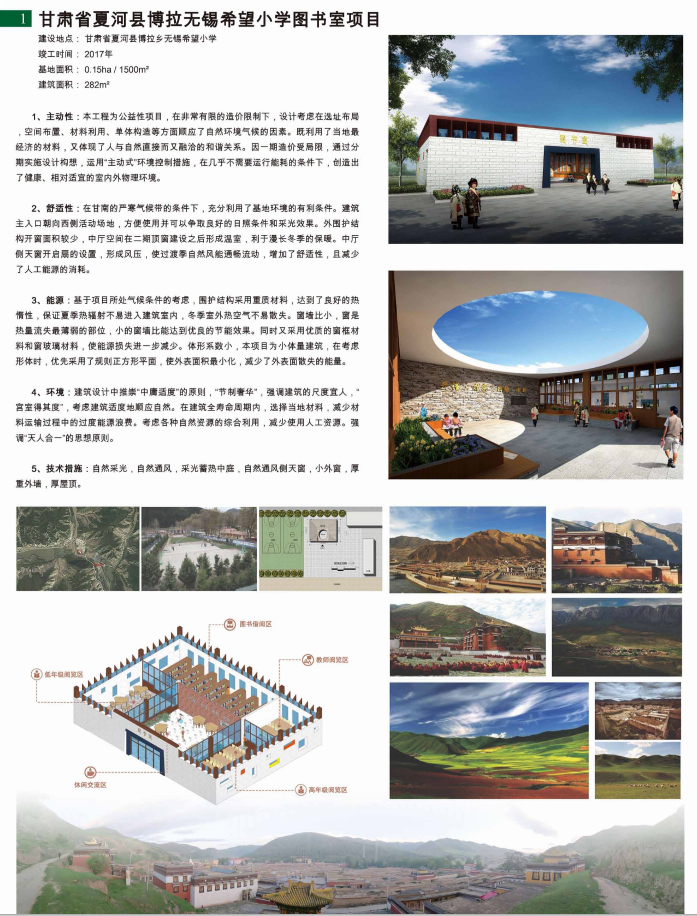 专家评语-刘艺:威海虎头角音乐厅的设计是一项有趣的挑战。项目选址既拥有优越的景观资源,也会直面海滨风雨的侵蚀和不利的光热声学环境。设计充分运用多种技术策略,通过曲面的可变化外层玻璃壳,提供了冬季太阳能房和夏季遮阳通风腔的转换可能,建筑以主动的姿态应对环境条件。海水源热泵和温湿分控的空调系统也有利于能耗节约,体现出环境友好。 甘肃省夏河县博拉无锡希望小学图书室项目AH2020-031设计单位:上海华都建筑规划设计有限公司设计团队:余琪、雷李坤、张朝阳、詹书俊、张一猛、曹馨雅