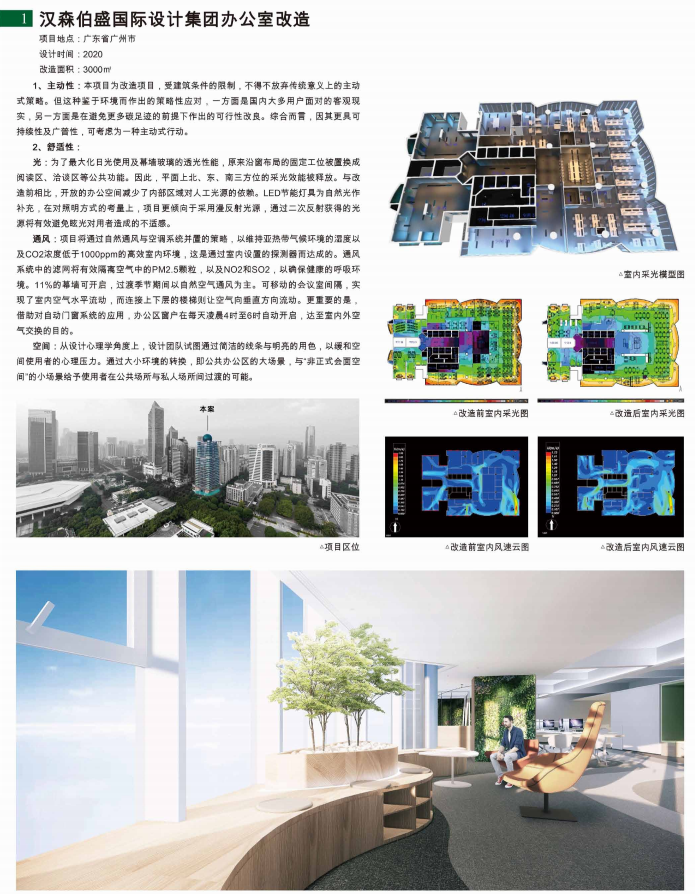 通过10%的室内种植面积、天然采光的公共与半公开空间、简洁的线条与明亮的色彩,营造缓冲使用者心理压力的空间与环境;将天然采光效果较佳区域的北、东、南侧的固定工位置换成阅读、洽谈等公共功能,开放的空间布局减少了对人工照明的依赖,提高了室内光环境质量;采用自然通风与空调机械通风并置的系统、11%的可开启幕墙、移动的会议间隔断、新设置的连接两个办公空间的楼梯、凌晨4-6点的自动开启的窗户保障了较高的空气质量;废热回收、冷凝水再用、高效能设备、长寿命家具等措施,有效降低了碳足迹。