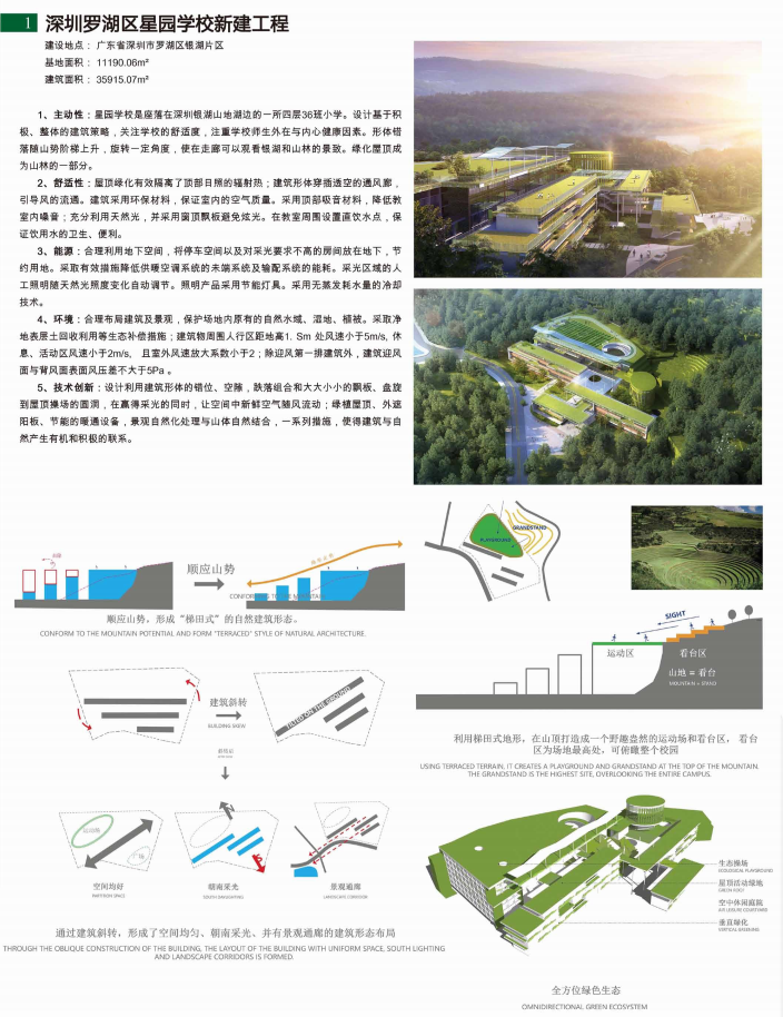 专家评语-刘艺:深圳罗湖区星园学校是一个充分利用建筑手段而不是设备手段,实现环境舒适度的案例。设计有效结合地形,退台绿化隔热屋顶和架空通风层反映了南方亚热带气候的建筑特征。设计尚可商榷的是建筑对于原始山体的挖切太多,环境影响较大,建议进一步优化。