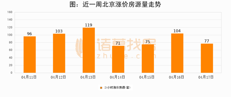 根据诸葛找房数据显示,北京24小时涨价房源量为77套,较04月16日减少27套,环比下降26%。与此同时,涨价房源占比小幅回落,对于购房者来说是一个入市窗口期,购房者可抓住时机入市。