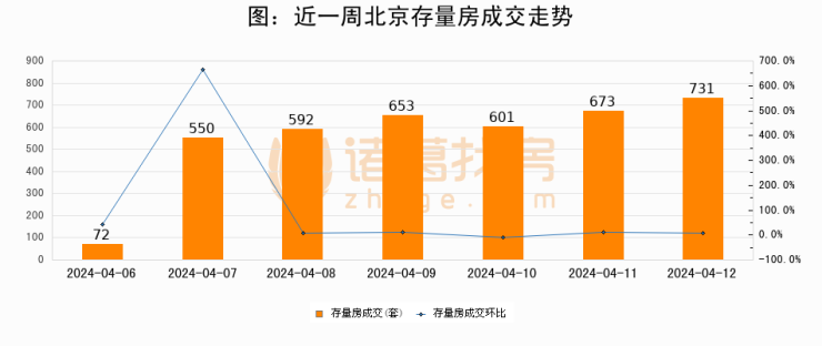从存量房来看,2024年04月12日北京存量房单日成交731套,比昨日增加58套,环比上涨8.6%。从近一周存量房成交来看,北京存量房日均成交套数为553套,04月12日单日成交731套,高于近一周平均水平32.2%。