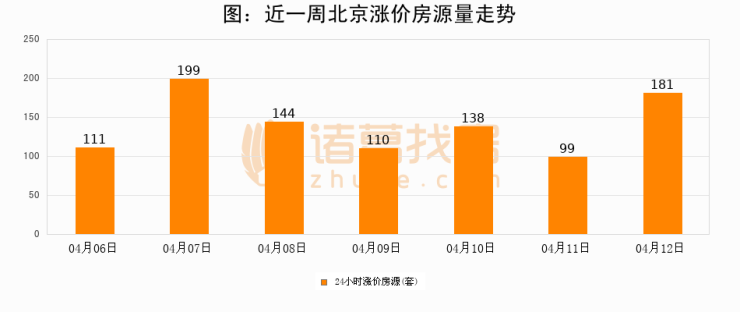 根据诸葛找房数据显示,北京24小时涨价房源量为181套,较04月11日增加82套,环比上涨82.8%。与此同时,涨价房源占比小幅扩大,业主信心有所提升。