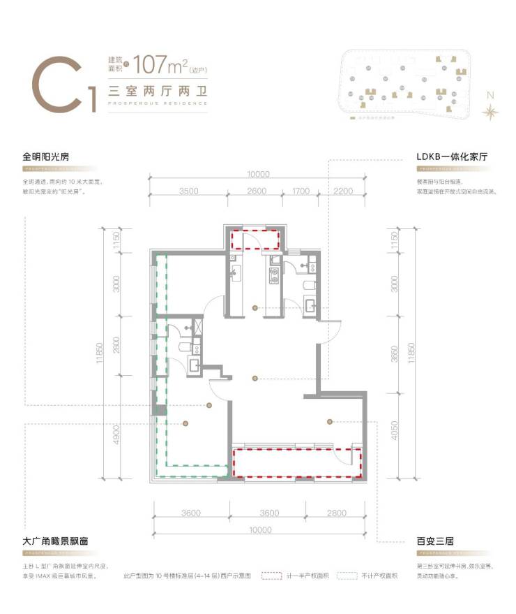 边户客厅面宽4.1米,中间户4米;客卫的设计不同,让整个户型其他功能区的面积,有所不同;边户飘窗涵盖主卧、客厅、厨房、客卫,中间户则只有主卧有飘窗。这导致它的边户和中间户的实际得房率,能差出5个百分点。