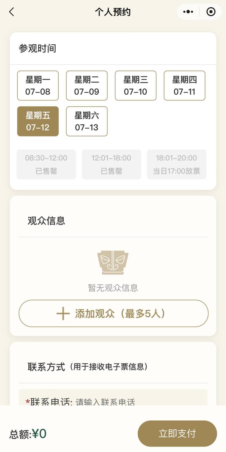 广汉三星堆博物馆截至7月12日可约的白天场门票都已约满,7月13日尚有余票。
