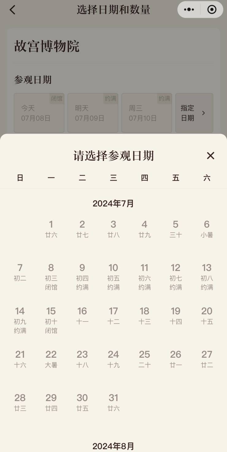 如故宫博物院截至7月14日可约的门票都已约满。