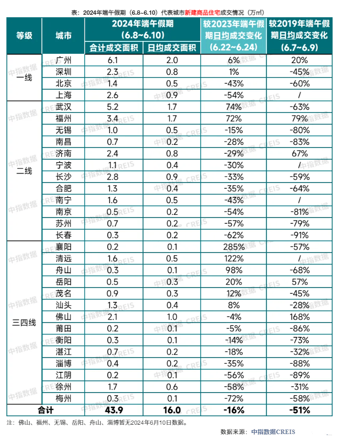 根据中指数据,今年端午假期期间(6月8日-6月10日),北京、上海、广州、武汉、福州等30个代表城市新房日均销售面积较2023年假期下降约16%,但较今年“五一”假期日均成交增长超六成。
