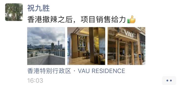 4月14日,万科总裁祝九胜在其个人微信朋友圈发布消息,“香港撤辣之后,项目销售给力”。