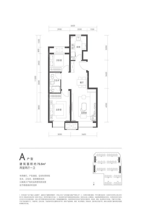 该户型整体较方正,空间紧凑。户型为东西向,南面面宽6.6米,进深11.2米。作为价格较便宜的户型,首付98万起非常适合刚需。不足之处在于,次卧空间约7-8平米,作为卧室稍小。卫生间为暗卫,通透性不足。