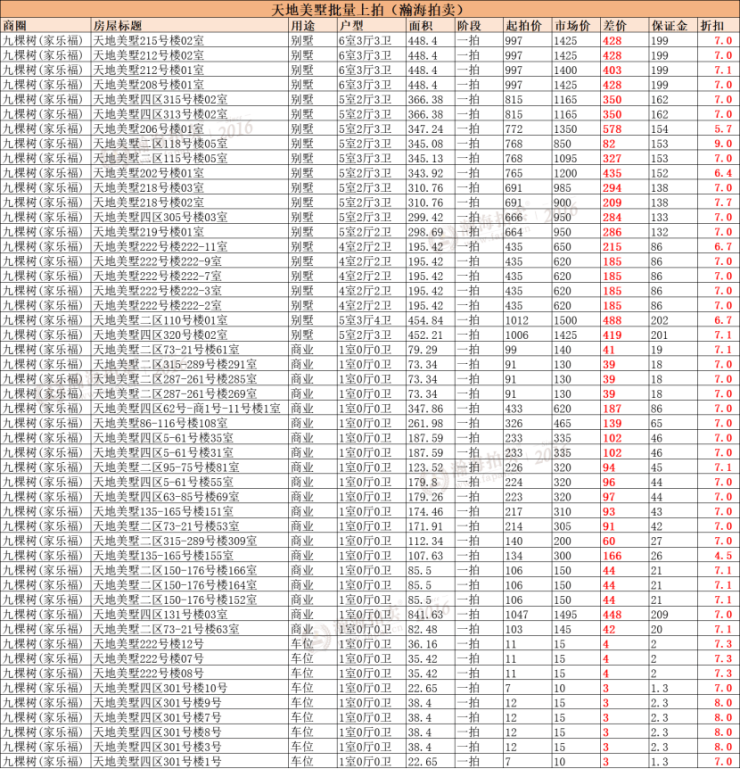 法拍机构瀚海拍卖提供的数据显示,天地美墅法拍房源面积从70至1400余平方米不等,起拍价格最低不足百万元,最高超1800万元,是市场价5-8折,均是首次上拍。