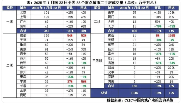 值得一提的是,1月重点城市二手房市场相对新房表现依然更好。克而瑞监测显示,1月前22日,33个重点城市二手房成交面积预计为1346万平方米,环比下降19%,同比增长19%,涨跌幅均小于一线,延续高位震荡行情。