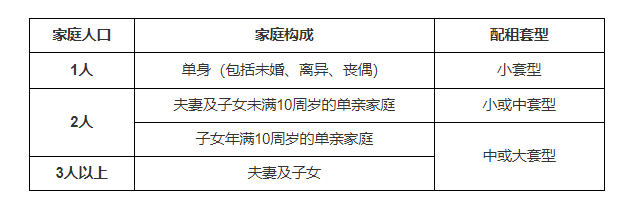 登记家庭应在保障性住房备案资格规定的配租套型标准内选择唯一套型(如小套型、中套型、大套型)进行意向登记。保障性住房规定的配租套型标准为: